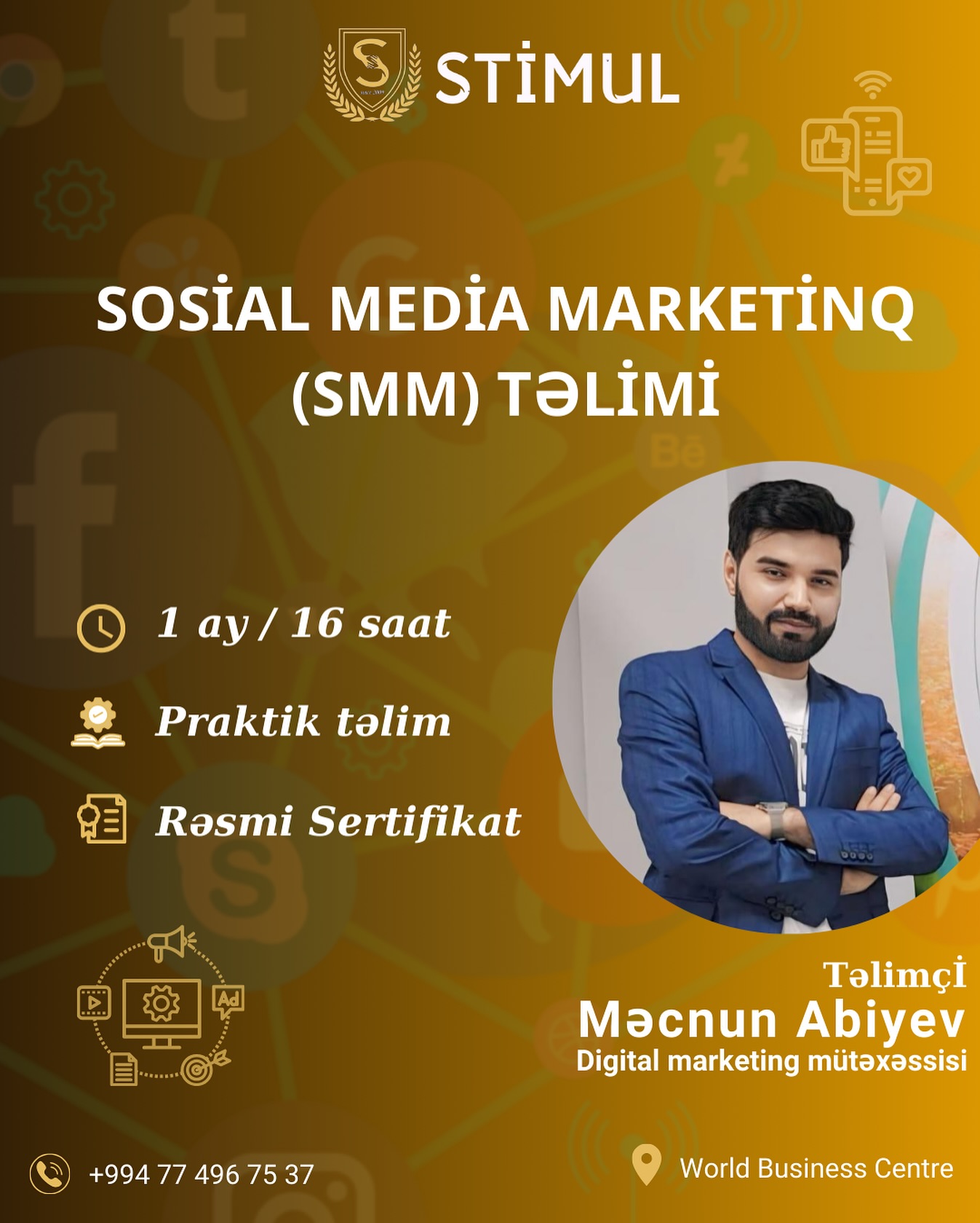 Təlimçi digital marketing üzrə mütəxəssis Məcnun Abiyevdir. İlk dərs sınaq dərsidir və ödənişsizdir. Yoxlayın və dərslərimizin keyfiyyətindən, müəllimlərimizin peşəkarlığından əmin olun.